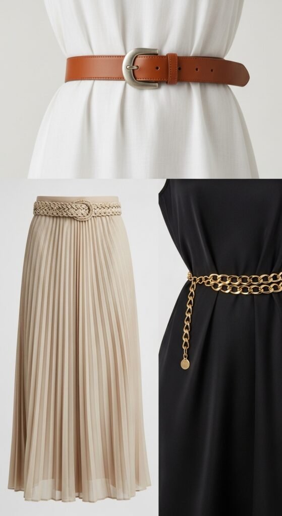 • Chain or metallic belts: Great for adding sparkle to an evening outfit.