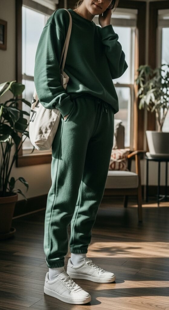 Matching sets are a Pinterest favorite for a reason. They look intentional with very little effort. A muted green lounge set keeps things casual while still fitting the theme.