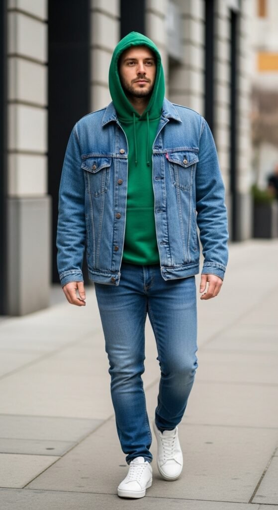 Layering makes this outfit practical and relaxed. A green hoodie brings color. A denim jacket adds structure. Jeans keep everything cohesive.